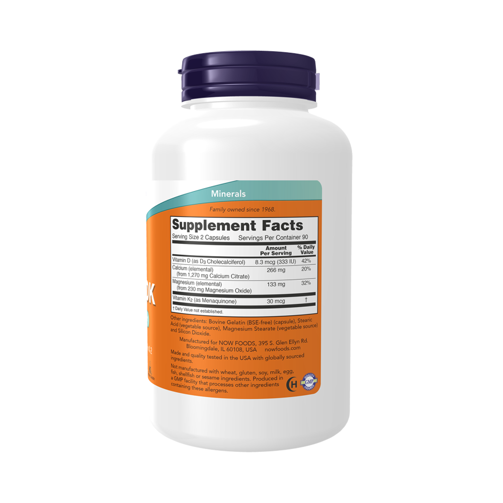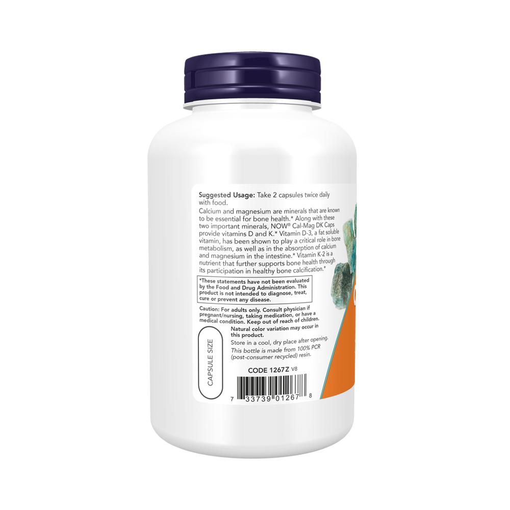 NOW Cal-Mag DK Caps содержат витамины D и K. Доказано, что витамин D-3, жирорастворимый витамин, играет важную роль в метаболизме костей, а также в всасывании кальция и магния в кишечнике. Витамин К-2 является питательным веществом, которое дополнительно поддерживает здоровье костей благодаря его участию в кальцификации здоровых костей.